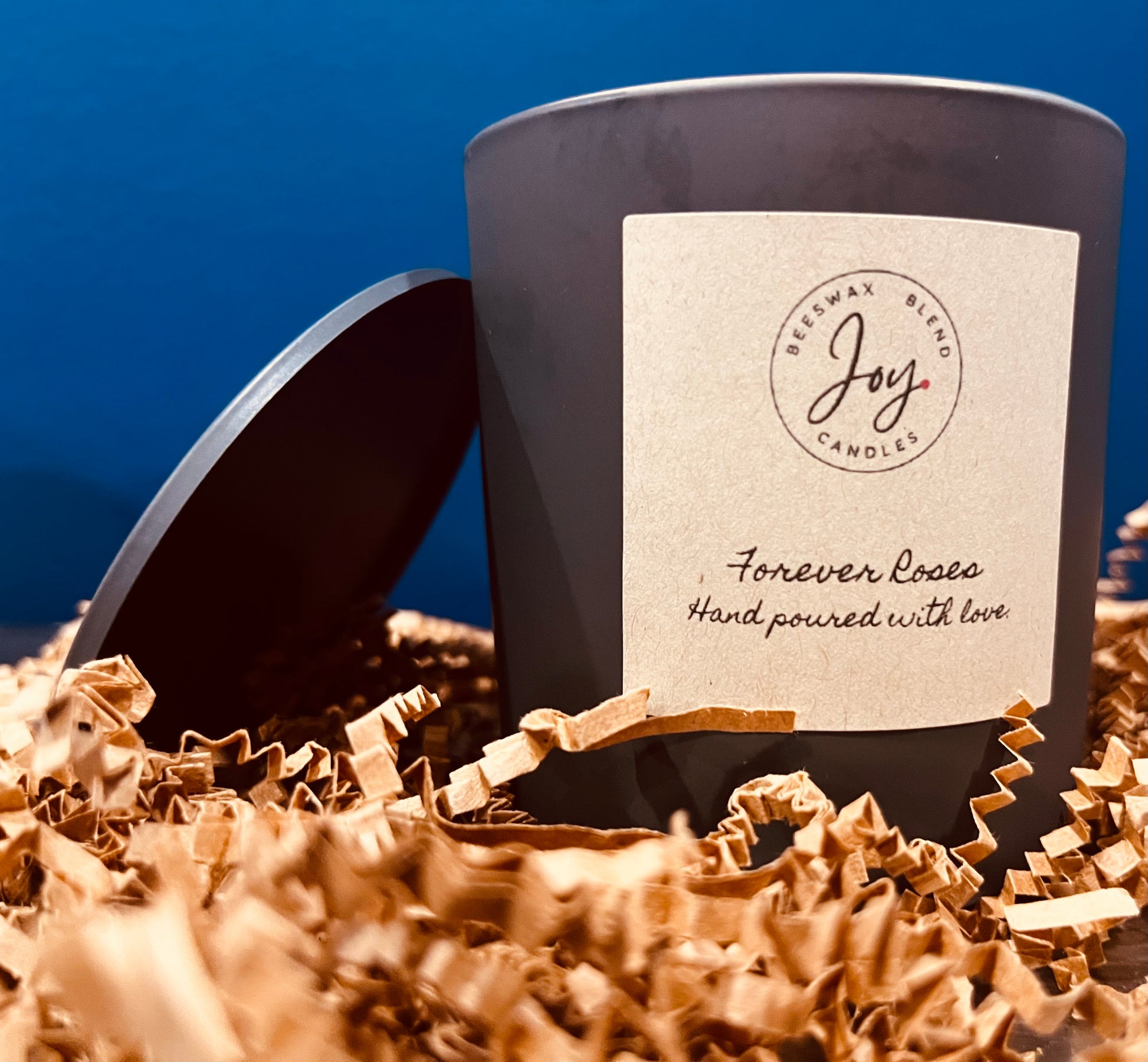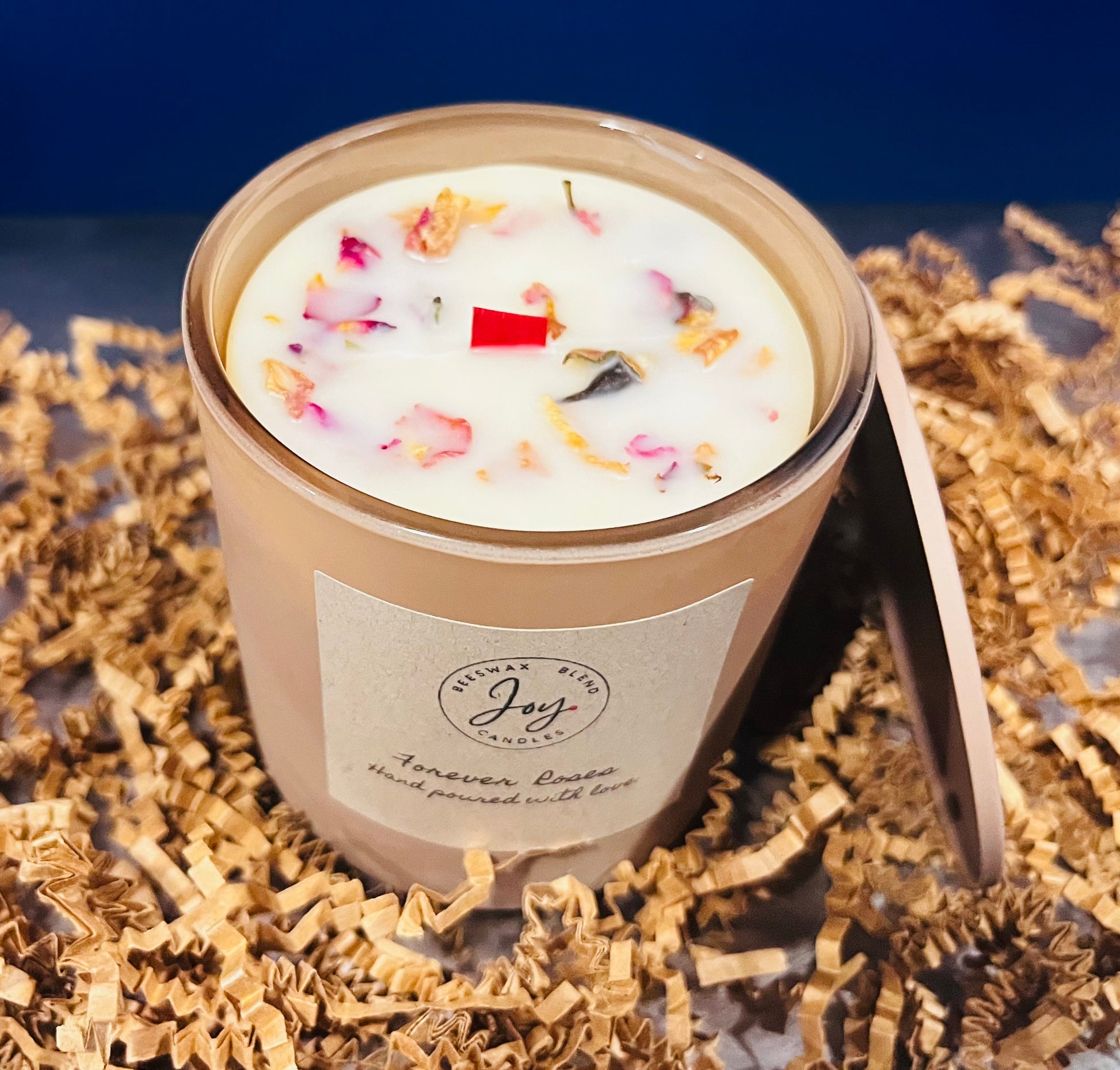 Made with all natural golden beeswax blend. Centered by a red wooden wick adds a pop of color. This candle is sprinkled with pink and red rose petals.